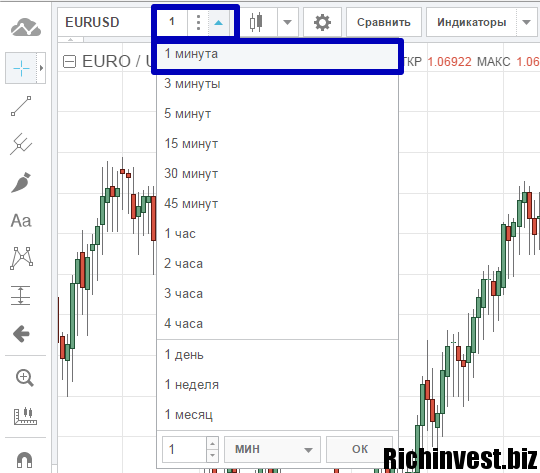 Чтобы котировки на техническом софте максимально соответствовали показателям котировок на платформе вашего брокера, переставьте таймфрейм графика технического сервиса на 1 минуту: