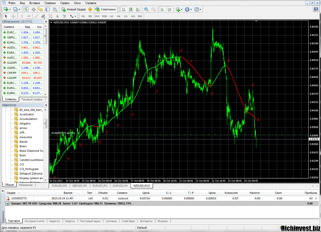 Более того игрок может входить на рынок по одному сигналу, так как львиная доля сигналов являются длительными. Также может сработать трейлинг, в случае незначительного отката стоимость и ордер завершиться. Но, если торговля осуществляться ручным способом, позиция будет завершать только с целью избежать рисков, но инструмент в это время показывается, что тренд движется по тому, же направлению, можно входить опять, в качестве примера на откате стоимости.